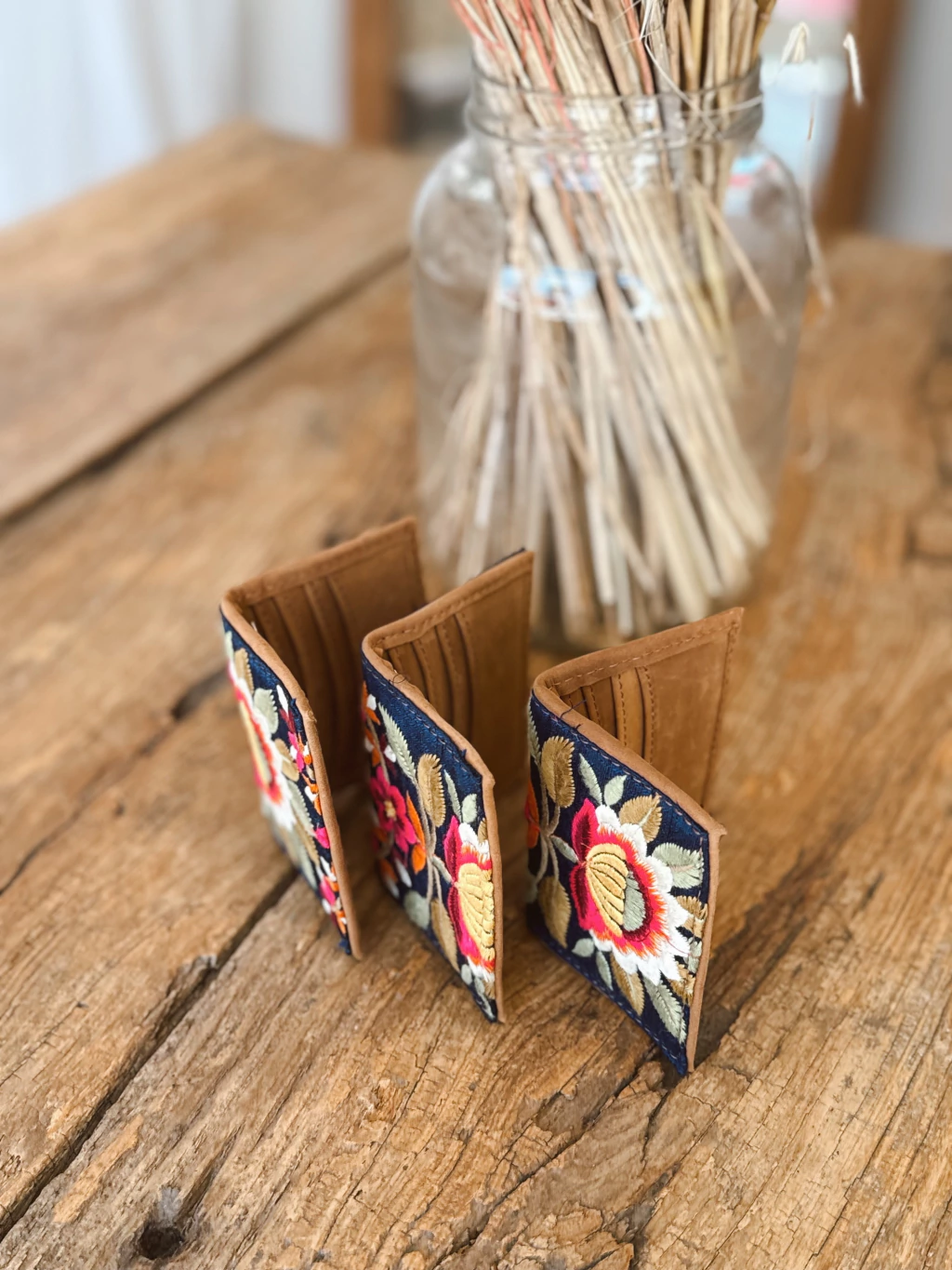 Este tarjetero artesanal combina la rusticidad del cuero con la delicadeza del bordado floral.